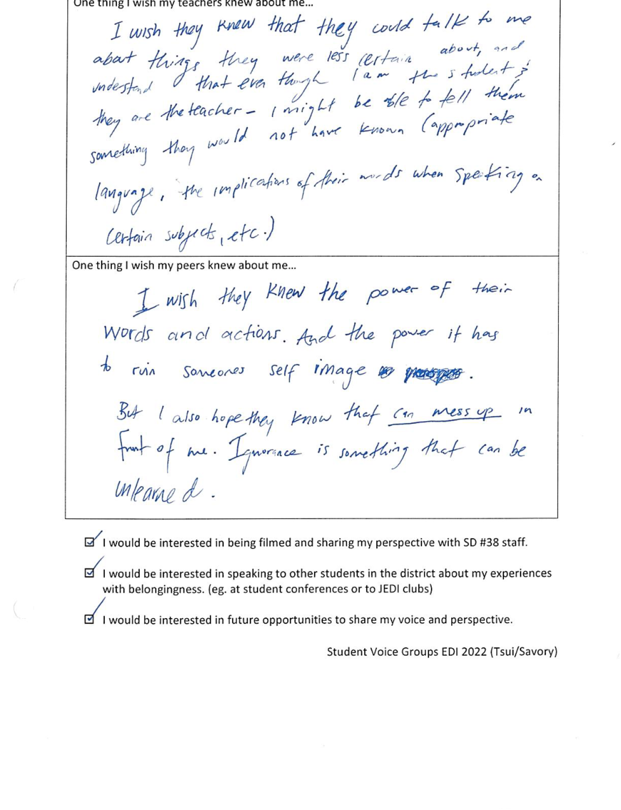 这所来一份学生的调查问卷,在学生同意的情况下,校方公开了这名学生所写地部分内容。第一个问题是:One thing I wish my teachers knew about me(我希望老师们知道关于我的一件事情)。第二个问题是:One thing I wish my peers knew about me(我希望我的同学们知道关于我的一件事)。